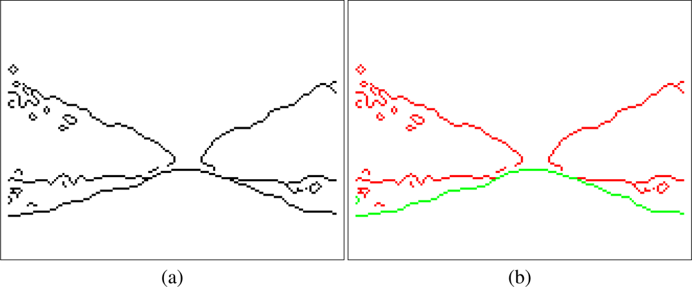 Figure 5(a) shows the borders obtained after applying “canny”. At first sight, the five representative lines which represent the borders between classes can be seen. Among these five lines, only two of them (highlighted in green in Figure 5(b)) have to be extracted. These two lines represent the boundaries between Soil/Land and the orange trees. Although the other lines (highlighted in red in (b)) are also important they are not used at this stage of the system.