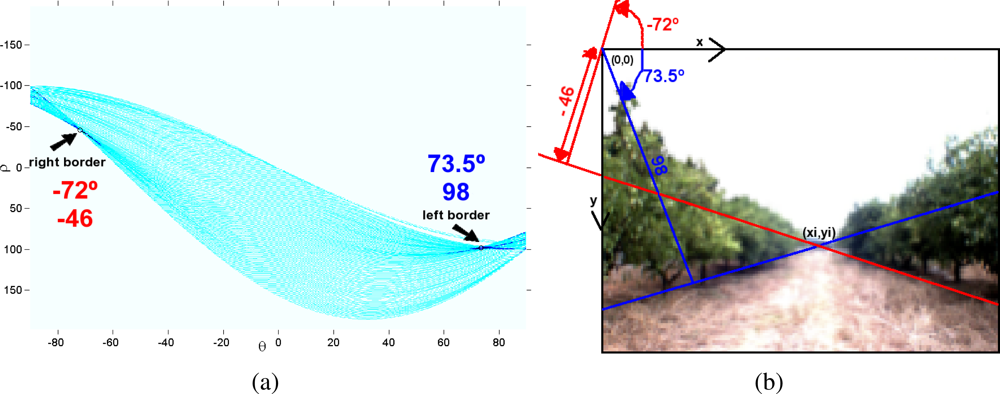 In Figure 6(a) a representation of the Hough’s matrix is shown where light blue stands for the lines with low votes and dark blue are assigned to the lines with highest vote values. According to the structure of the groves, the right border is represented with a negative angle whereas a positive angle is related to the left border. For this reason, one line with positive angle and one line with negative angle are selected from the Hough’s matrix according to their values. Concretely, the “positive” and “negative” lines with highest number of votes are extracted. In Figure 6(b) these two lines are drawn over the original capture. Moreover, the normal of those lines that passes over the center of coordinates (0,0) is also drawn because the parameters of the Hesse equation (angle and displacement) are related to it.