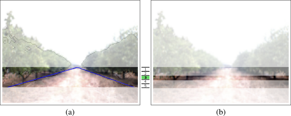 In the image shown in Figure 8, it can be seen that the real left and right borders can not be represented by a simple line. For this reason, the area in which these borders are located has been vertically split into n different subareas. After performing some experiments, n has been set to value 5.