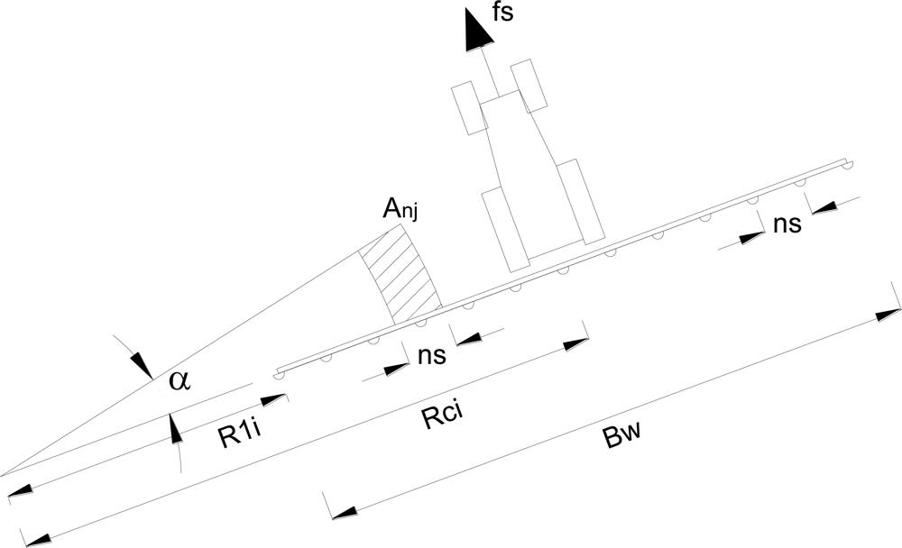 The height of the boom is that which, depending on the nozzle type, allows the necessary covering to obtain a uniform treatment of the work surface. Assuming that the equipment follows a circular trajectory with a work radius Rc (m) and considering any nozzle on the boom, the dose per surface unit for the area treated by each nozzle is obtained using the following parameters and equations (Figure 1), considering Rci (m) as the radius of the tractor to the center of the circumference of the considered circular trajectory (calculated by the GPS system).