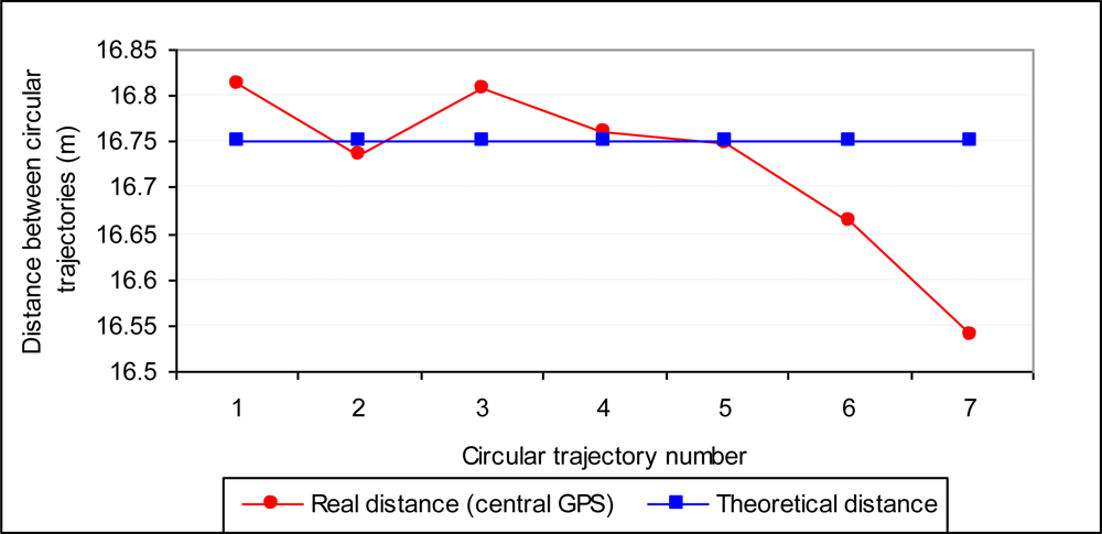 The real median value of the distance between the circular trajectories obtained from the GPS RTK in the center of the boom was 16.7247 m, with a standard deviation of 0.095 m and a minimum-maximum range of variation of 16.54060 m–16.81220 m (Figure 10). If we compare these data with the programmed distance in the self guiding system of the tractor (16.75 m), the quality of the work performed can be concluded to be valid. In addition, the larger errors, as shown in Figure 10, were generated in passes six and seven, which were nearest to the center of the circular trajectories (smaller radius) and were, therefore, those in which the overlap between passes affected a smaller area of the plot. The sums of all the concentric distances were 117.25 m for the theoretical scenario and 117.07 m using the data provided by the GPS RTK located at the center of the boom.