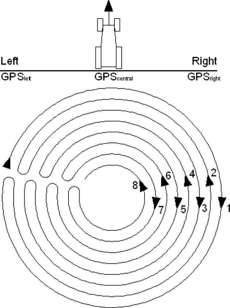 Agricultural tasks conducted using circular trajectories usually employ GPS technology to guarantee concentric patterns. This technology, applied to farm tractors, allows the instantaneous displacement velocity and the position of the equipment to be known [10,11]. Its application to plot courses with circular trajectories is a commercial reality and has been analyzed in different research studies for determining field efficiencies [12,13].