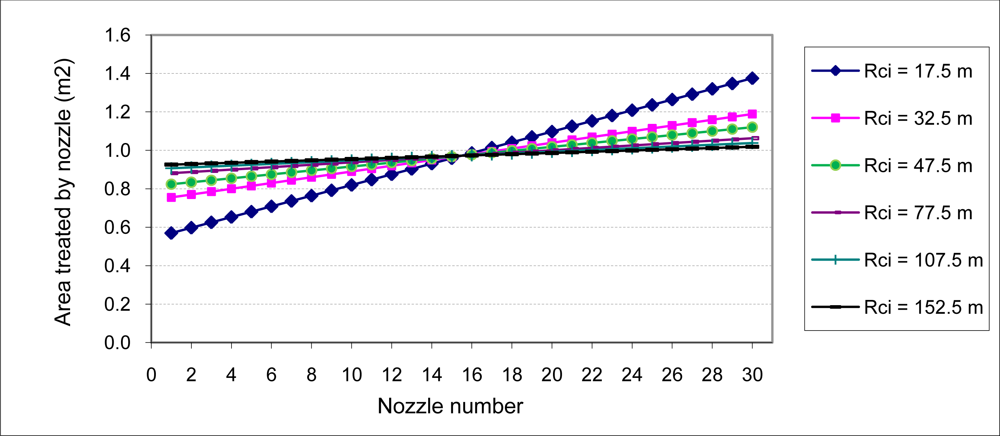 Develop a calculation methodology that allows the estimation of, in the case of circular trajectories with boom sprayers, the flow of the individual nozzles on the boom to guarantee that the dose of the product applied per surface unit is similar across the plot.