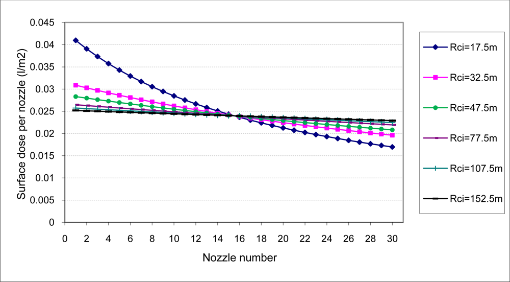 In the same way, the theoretical surface dose that each of the nozzles should apply per surface unit corresponds to that of the nozzle located on the center of the boom that would be the same as the rest of the nozzles if the equipment was traveling in a straight line. Figure 4 shows how such doses are reduced in the outer nozzles and increased in the inner nozzles. This phenomenon becomes increasingly important in circular trajectories with a smaller work radius.