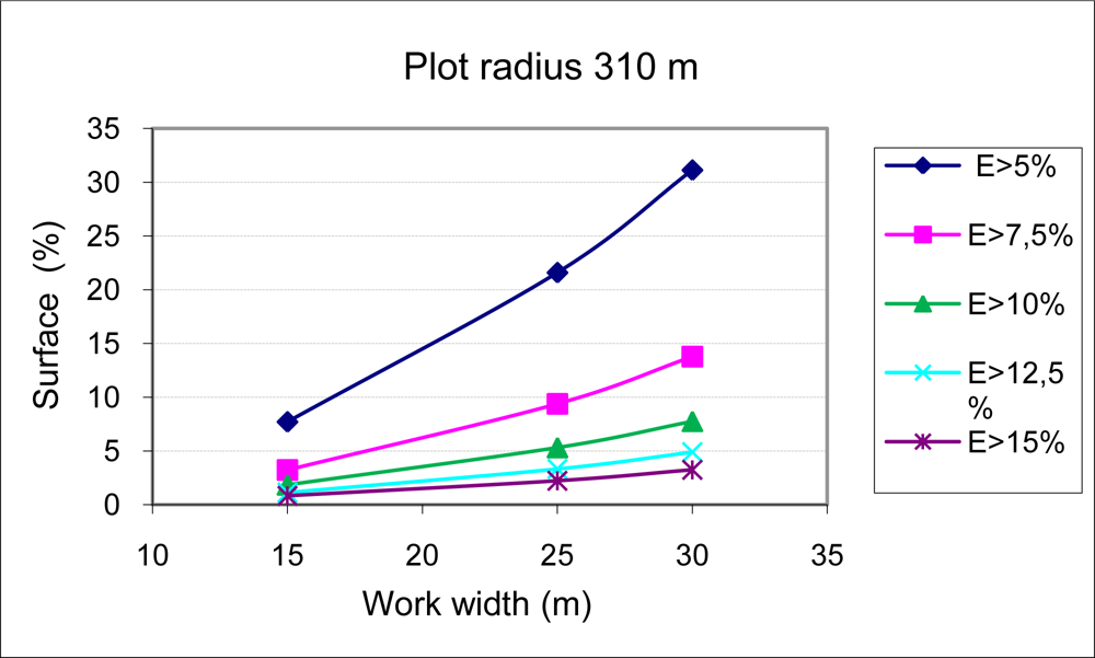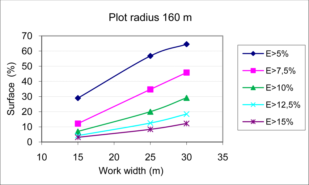 The results of applying equation 6 to two circular plots with radii of 160 m and 310 m, using three sets of equipment with boom widths of 14.5, 24.5 and 29.5 m (work widths of 15, 25 and 30 m), are shown in Figures 5 and 6. Figures 5 and 6 show for every boom width and plot size the percentage of the surface in which the surface dose has exceeded different values of percent variation of the fixed nominal surface dose to be applied as treatment (L/m2). With decreasing boom widths, there is an increasing homogeneity of treatment, while the applied dose per surface unit has a greater variability in equipment with large work widths. This phenomenon is of greater importance in plots with less surface area.