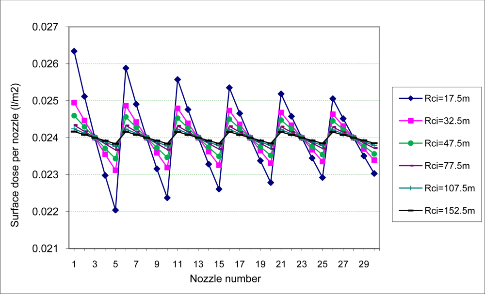 As a practical example, the percentage variation of the surface dose applied by the nozzles of a boom sprayer with a 14.5-m-wide boom equipped with 30 nozzles each separated by 50 cm was considered.