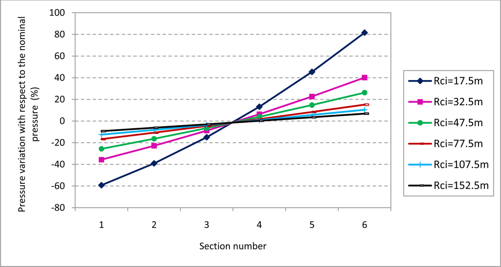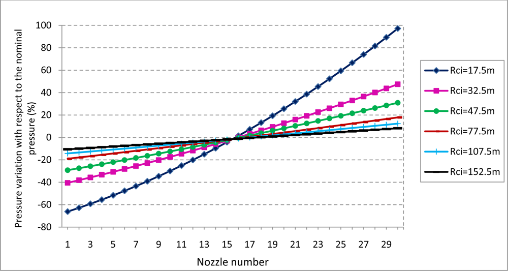 Control of Nozzles. The individual control of the flow of each nozzle would guarantee an uniform superficial dose. To accomplish this, the work pressures of the nozzles must be modified individually on the basis of Equation (9). The nozzle pressure (considering the nominal pressure of 2 bar) varies between 0.676 bar (−66.18%) and 3.944 bar (+97.19%) when the trajectory radius is 17.5 m (Figure 9). The pressure variation decreases drastically with the increase of the trajectory radius. For instance, considering a trajectory radius of 32.5 m the nozzle pressure varies between 1.19 bar (−40.49%) and 2.95 bar (+43.79%). These pressure values are according to the pressure ranges admitted by the majority of the commercial nozzles used in boom sprayers.