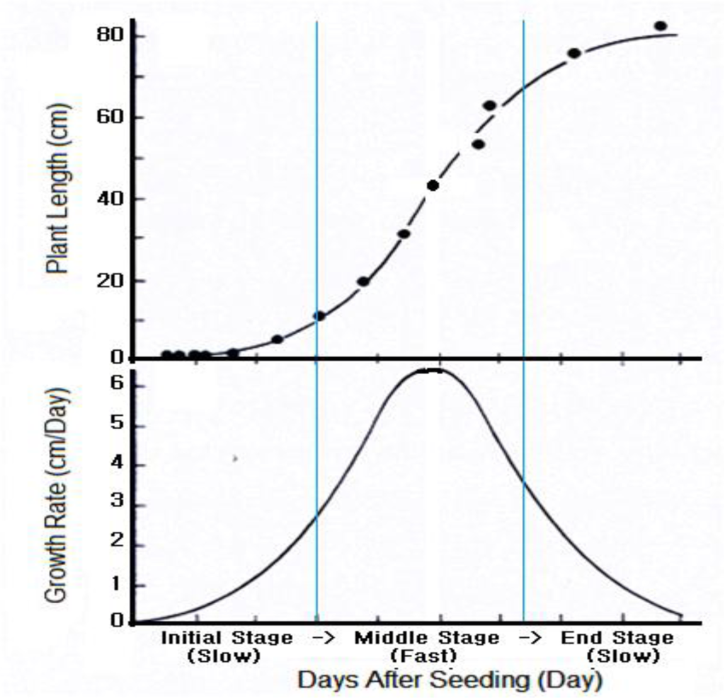 The plant growth process is divided into three parts: growth, differentiation and development. The growth, which is a phenomenon involving an irreversible increase in size of tissues and organs as well as weight, is a quantitative change of the plant. The differentiation, which is an actual formation of tissues and organs is a qualitative change of the plant. The development is the growth and the differentiation of the plant body as time goes by. The overall plant growth stages can be summarized as follows: fertilization → gemmule → seed → germination → seeding → growth → flowering → fruit → aging. As seen in Figure 1, the general plant growth rate is represented by the curve known as Sigmoid curve that is classified into three stages: initial (slow) stage, middle (fast) stage and end (slow) stage. The initial stage is a period when plants establish their bodies after germination with the stored nutrients. In the middle stage, plants push out new shoots from the ground and complete their root systems. Biosynthesis and photosynthesis of leaves also occurs vigorously at that time. In the end stage, the plant growth rate slows down and there will be the competition for metabolites, water, light and mineral nutrients, as well as the accumulation of growth inhibitors [3].