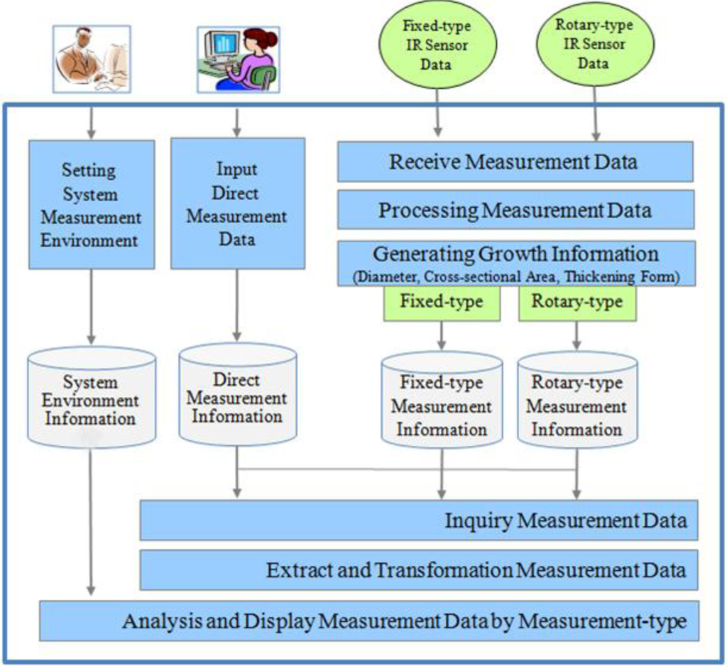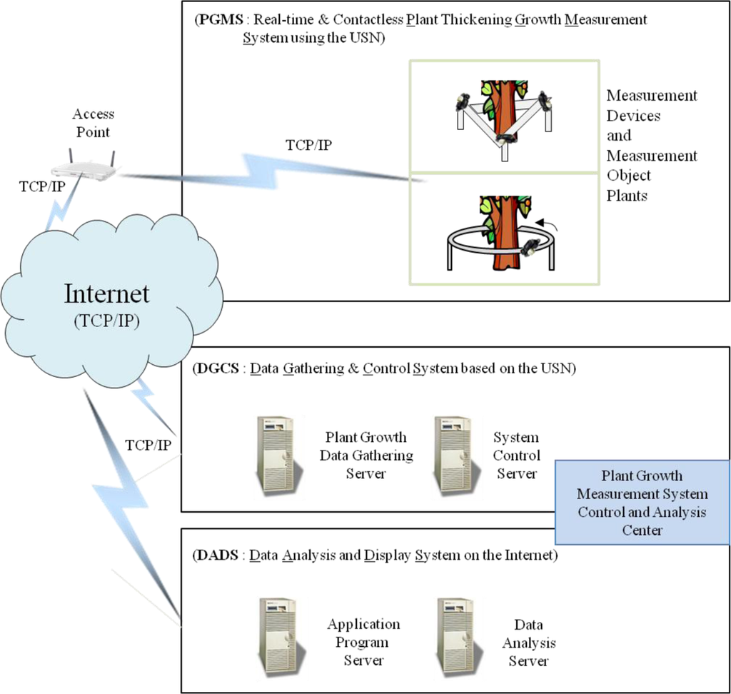 The proposed real-time non-contact plant thickening-growth measurement system is shown in Figure 7. The system consists of three sub-systems: plant growth measurement system (PGMS), data gathering and control system (DGCS), and data analysis and display system (DADS). The PGMS receives control commands from the control center, measures thickening growth of the corresponding plants, and sends the measured data to the plant growth data gathering server in the DGCS. The DGCS transmits data through the USN, stores the transmitted data and commands the PGMS to measure the plant growth. The DADS analyzes the measured data and provides the results to users in real-time. The proposed system measures plant stems by using non-contact sensors and provides plant growth information such as diameter, cross-sectional area, and thickening form. If we use the existing plant measurement methods, we can only measure the diameter of a plant. However, the proposed system enables us to estimate not only the diameter, but also the cross-sectional area and the thickening forms of plants at remote sites in real-time.