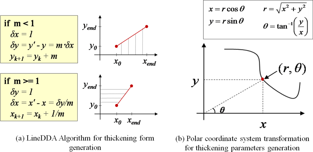As described in Section 3.2, in order to generate the plant growth information, the distance between the plant and the sensor should be first obtained by using the distance adjustment formula; MD = CD + AV. Note that the MD is the average measured distance between the sensor and the target plant. If we subtract the MD from the distance between the sensor and central point (r), we can get a stem’s average radius (ȓi) at the corresponding measurement point. Also, by calculating the average of the average radii at all the measurement points, we can get the stem’s average radius (ȓ) of the target plant. Meanwhile, in order for calculating the cross-sectional area and the thickening-growth form of the plant stem that has different radii, 2-dimensional polar coordinate system transformation can be used. Polar coordinates can easily be transformed to circular coordinates, which enables us to get the cross-sectional area and form of the plant stem. Figure 16 shows the principle and the formula of coordinate transformation between plane coordinate (x, y) and polar coordinate (r, θ) as well as the LineDDA algorithm.