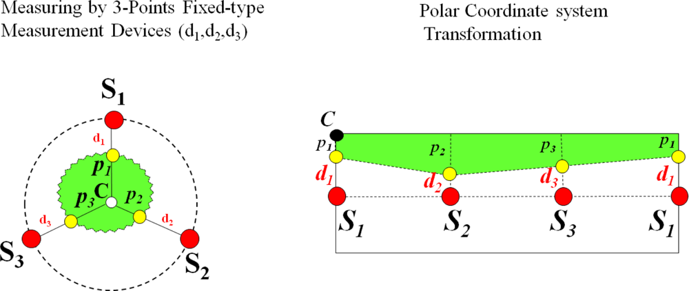 In order to apply the above-mentioned algorithm and method to the data that will be measured by non-contact IR sensors and calculating the cross-sectional area of the plant stem, we have installed three sensors around the target plant for the fixed-type measurement. The sensors are equally spaced and the target plant is centered from these sensors. Figure 17 shows the polar coordinate system transformation with three IR sensors around the target plant. As shown in this figure, from the circle that is formed by three sensors, we can get four polar coordinate points. The next step is to connect the line segments by using the well-known line digital differential analyzer (LineDDA) algorithm (Figure 16(a)). After completing this, we can get the thickening form of the target plant as shown in Figures 18, 19 and 20, and can also easily get the circumference and cross-sectional area.