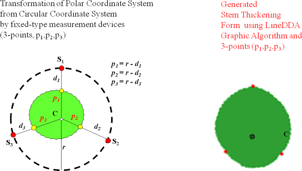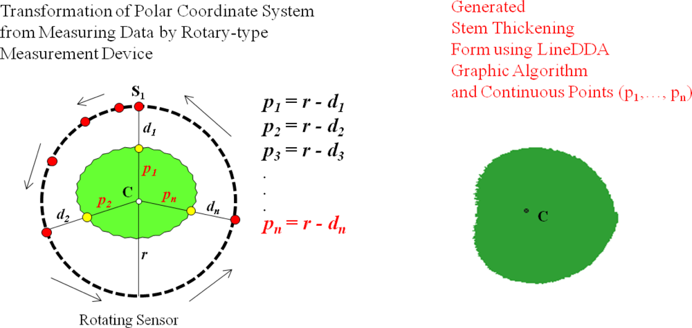 There are several ways to calculate the cross-sectional area by using the polar coordinate system. The first method is to pre-calculate the area of one pixel on the polar coordinate and then multiply this by the number of pixels from the measured data. Although this method is useful for a fixed image, it is hard to make generalizations about the case that has any measured data. The second method is to calculate the average radius from many different radii and then use this for calculating the cross-sectional area of the target. The measurement error of this method is tolerable if the thickening form of the target is close to a circle. But, in case that the target has an indented thickening form, the measurement error increases accordingly. The third method is based on the characteristic that any line segment for the measured data on the polar coordinate is identical to the circumference of the circular coordinate. Therefore, we can obtain the cross-sectional area simply by substituting the length of line segment to the formula for calculating the area of the circle [14]. The proposed system uses the third method to calculate the cross-sectional area of the target plant stem as it has a minimum error compared to other methods and is easy to apply to the measured data from the PGMS. The thickening form of the target plant is displayed by transforming the polar coordinate into circular coordinate again.