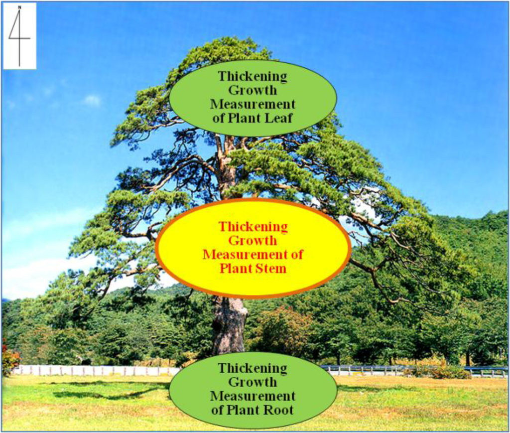 The growth characteristics of plants vary depending on the type of plant. Generally, plant growth measurements are taken for roots, stems, leaf area, leaf fat, stem cross section, leas section and so on. Figure 2 shows general plant growth measurement locations. The results of these measurements are used for assessing influences of climate, soil, nutrients, disease, and pests. Recently, measuring plant growth changes at a country level has become very important to look out for any climate changes. If we can precisely measure the plant growth per each growth cycle, we can make a detailed plant growth model and at the same time accurately predict and control the production of plants depending on environmental changes. Therefore, a real-time measurement system for the plant growth is very important in the fields of agriculture and forestry [4].
