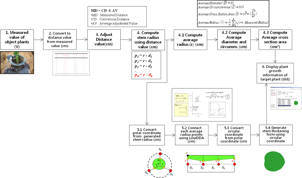 The DADS calculates the radius, diameter, circumference, and cross-sectional area of the target plant by using the collected growth data. In particular, the proposed system can generate the stem’s thickening-growth form by applying the LineDDA algorithm and 2-dimensional polar coordinate-to-circular coordinate transforms, which has not been possible with the existing measurements tools and methods.
