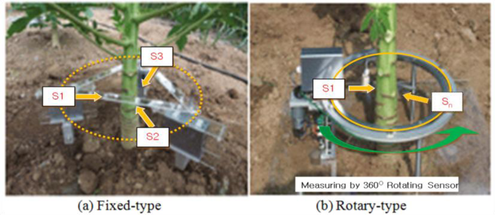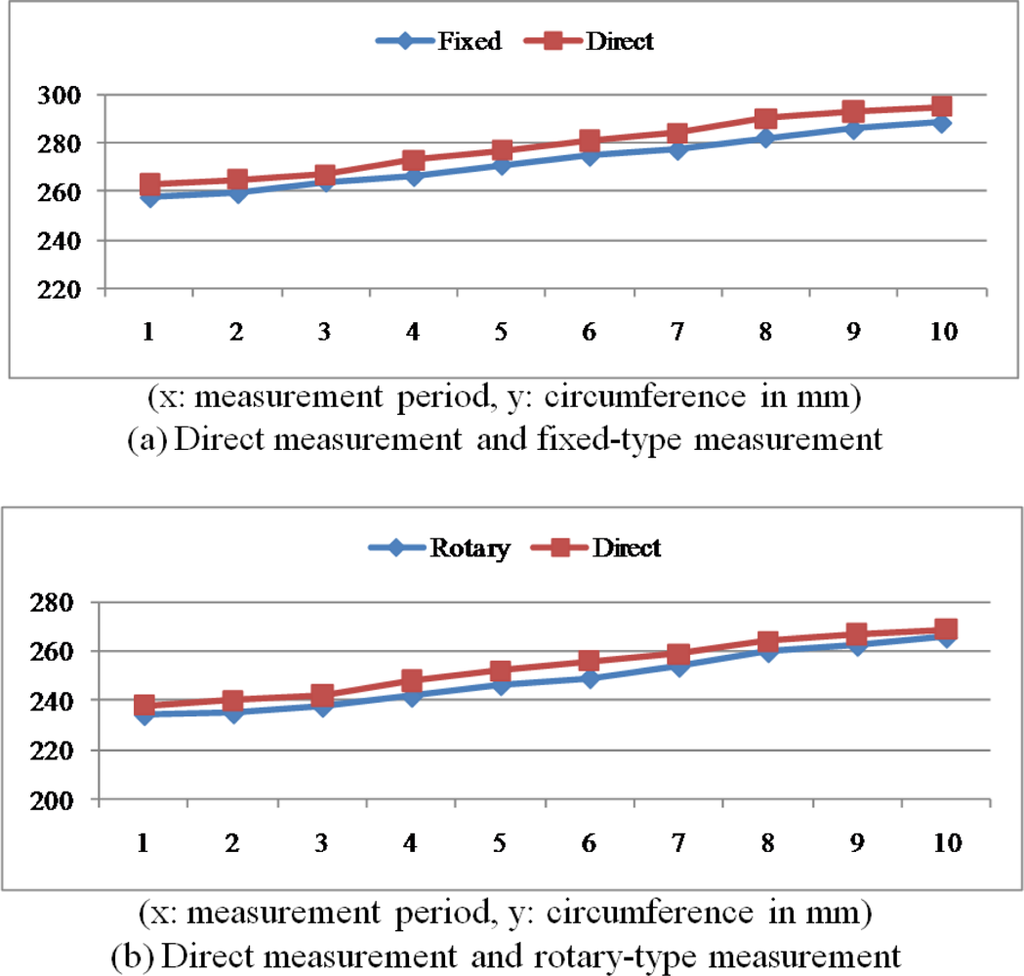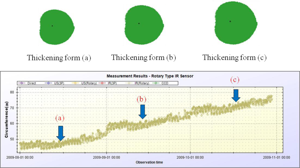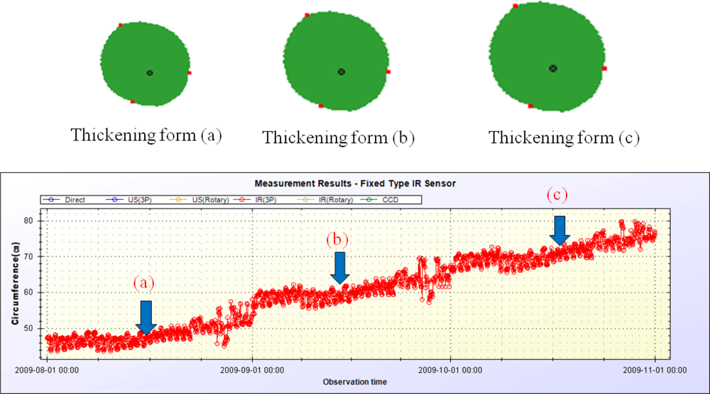 The plant growth measurement results by using the proposed system are understandable over all, but have abnormal results at some time points. That is, at some measurement points, the circumference is less than that measured in the past. These measurement errors are presumed to be due to the presence of foreign debris on the stem’s surface which results in sensing errors. If we compare the measurement results of the rotary-type IR sensor with those of the fixed-type IR sensors, we could see more detailed thickening forms in case of using the rotary-type sensor. Measurement errors are also decreased with the rotary-type measurement method.