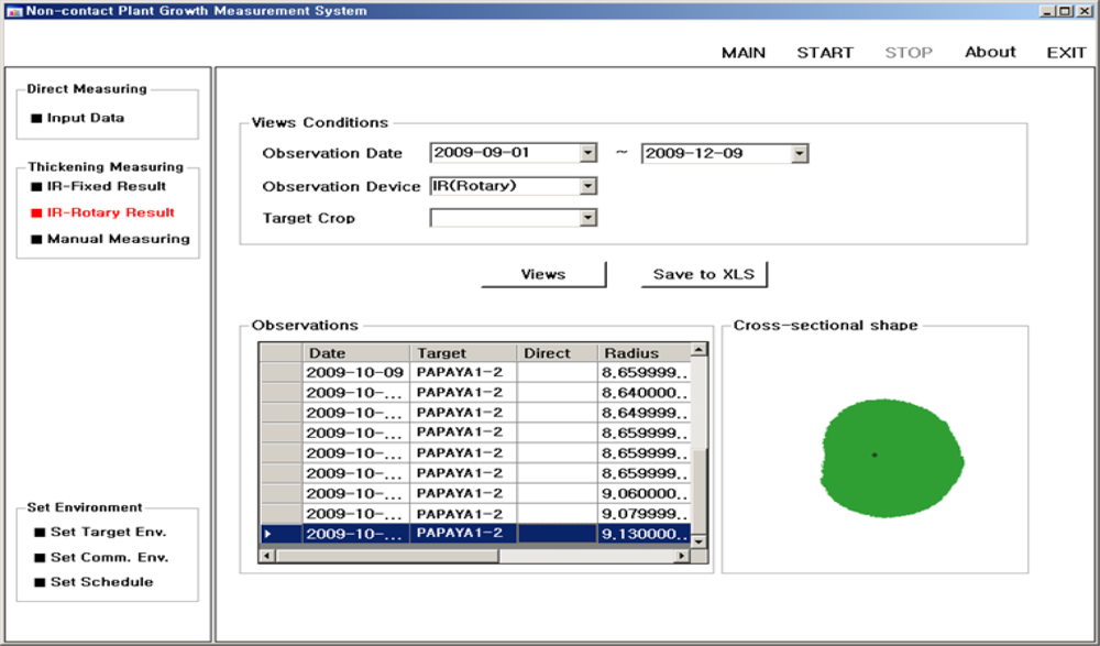 Figure 23 shows a graphical user interface (GUI) screenshot of the non-contact plant growth measurement system implemented at the plant growth measurement, monitoring, and control center. From the menu buttons on the left hand side of this GUI, we can choose the type of sensor and set the test environment. The duration of measurement and type of device can also be chosen from the ‘Views Conditions’ menu box in this figure. According to the test conditions that are set by this GUI, the remote sensors at the PGMS measures the target plants. The measurement results are then transferred to the DGCS and analyzed by the DADS to display the growth parameters as shown in the “Observations” and “Cross-sectional shape” menu boxes of Figure 23.