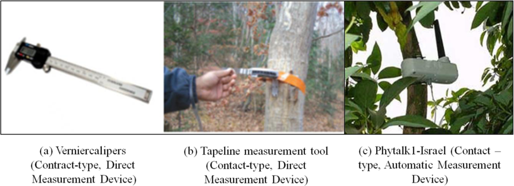 The traditional measurement for plant growth has been mainly done by human eyes reading direct manual measurement devices (Figure 3(a,b)). In recent years, tactile sensors with the automatic data measurement and transmission features have been partially used (Figure 3(c)). However, with these manual measurement devices, we cannot guarantee the reliability of the measurement data because there could be wide variations in the measurement data depending on raters, measurement devices used and method of measurement. In addition, manual measurement devices like vernier calipers and contact-type devices may affect plant growth because they can injure and stress plants. Furthermore, there might also be many side effects caused by frequent or periodic measurements of the plant growth. Also, it is hard to measure the plant growth in a wide area simultaneously, especially in alpine regions or islands. The direct manual measurements definitely result in safety problems and cost increases [5–8].