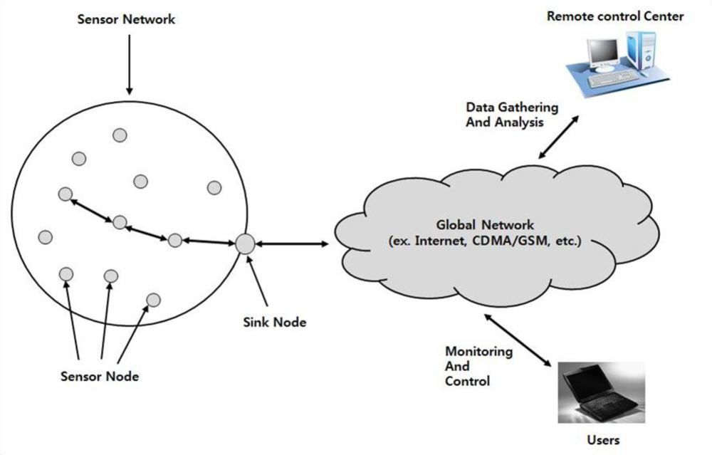 In the USN environment, we install sensors for monitoring the status of remote forests and agricultural areas and connect them to a remote control center via a sink node which has a connection to the Internet. Figure 4 shows the basic system structure using USN technology. In the figure, sensor nodes send the sink node any measured data that have been obtained according to pre-configured conditions and service requests from the control center. The data received by the sink node are transferred and stored at the control center through global networks such as the Internet and CDMA networks. The data are then analyzed to determine the growth characteristics of plants, used as statistical data, and finally provided to any interested users [2,9,10].