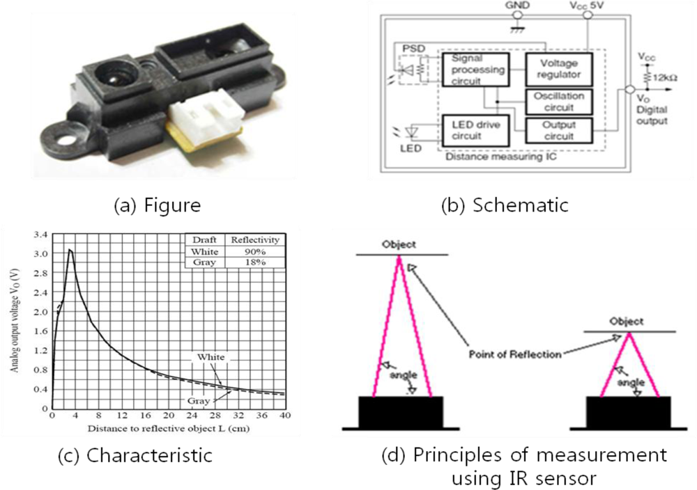 To measure the plant growth by using non-contact IR sensors, we have to apply infrared radiation to the surface of a plant stem and convert the amount of it blocked into some quantity of electricity. This method, however, can only be applied to the case that the distance between the sensor and the target is less than 10 cm. As the sensors in our proposed plant measurement system are more than 10 cm away from the plants, we have to use another method which uses the angle of the reflected infrared energy to calculate the distance between the sensor and the target. The transmitting and receiving components of the IR sensors should be equipped with lenses for blocking any external disturbing lights by infrared filters. Figure 5 shows the IR sensor used in the proposed system, its schematic, output voltage characteristic by the distance to the reflective object, and principle of distance measurement. Also, Table 1 shows electro-optical characteristics of the sensor and Table 2 summarizes the absolute maximum ratings of sensor parameters [13].
