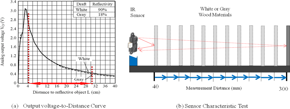 In order to measure the thickening-growth of a plant, the distance between the plant and the sensor should first be obtained by using the analog output voltage of the IR sensors. That is, the voltage variations or changes of the IR sensors are converted into distance information, but voltage values of the IR sensors are not directly proportional to distance information. Furthermore, infrared rays are easily influenced by sunlight. To deal with this kind of measurement errors and reliability issues, we have done several hundred pre-tests of the IR sensor to get more reliable voltage-to-distance data conversions. Figure 6 shows the experimental environment. In the experiments, the IR sensor at a fixed location gets analog output voltages by moving a white or gray wood plate in one millimeter steps within the measurement distance range (40 mm ∼ 300 mm). Then, by comparing the sensor’s measurement distances with the real distances, we have found the sensor’s average measurement errors and determined the distance-adjustment values for every distance in the measurement range.