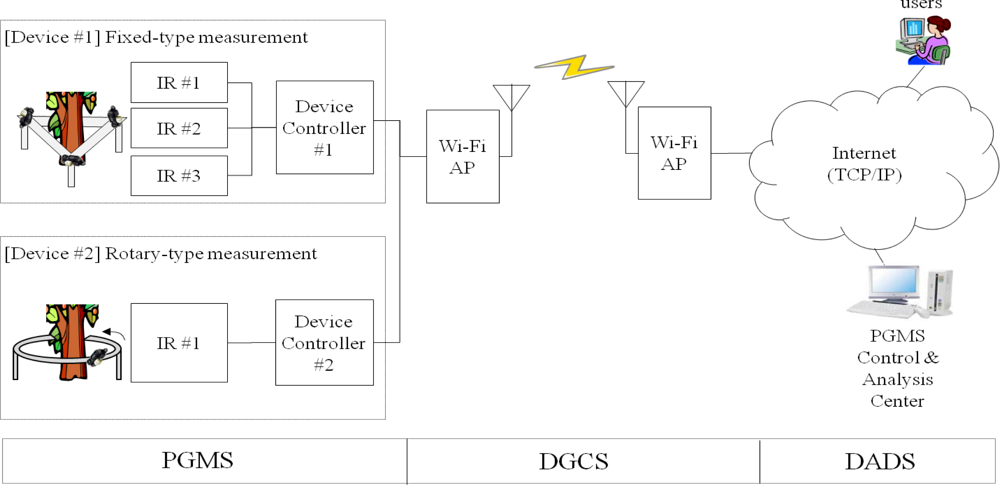 In this research, fixed and rotary measurement methods have been developed by using non-contact IR sensors in order to minimize the pre-described issues of the plant growth measurement systems as shown in Figure 8, where device #1 uses fixed IR sensors and device #2 uses a rotary IR sensor. More details of these two types of measurement methods are shown in Figures 9 and 10. Also, Figure 11 shows the 360° rotary-type plant growth measurement device that is designed and implemented in this research. This device is remotely controlled by the DGCS to measure the stem’s thickening-growth in a pre-defined measurement cycle. If the initial location (0°, azimuth) of the device is set due north, we can do a more detailed analysis on the growth status of the target plant by converting the measurement location into the azimuth angle. The sensors installed in the PGMS measure the growth parameters of the target plants and send the results to the DADS based on the USN technology in real-time. The USN technology-based DGCS sends the measured data from the sensor part of the PGMS to the server at the control center. Wi-Fi is used for the connection between the sensor nodes and the sink node, and access points (APs) is used for the connection between the sink node and local area network (LAN). Also, for optimizing experimental environment directional antenna (2.4 GHz, 13 dB, 35°) is installed for the place where buildings or obstacles are concentrated.