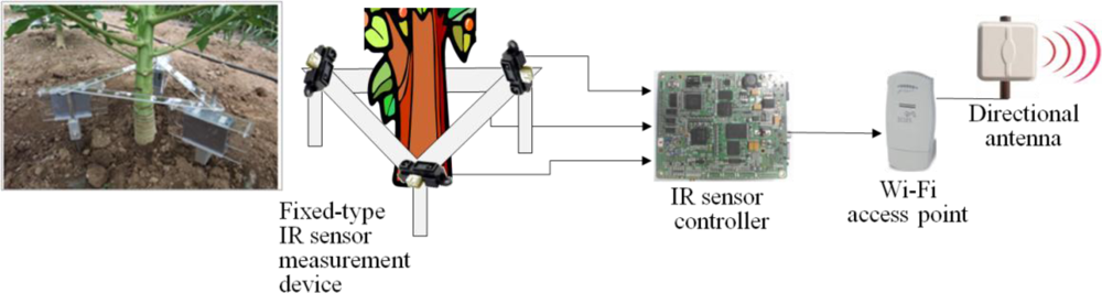 This paper proposes a non-contact plant growth measurement system using infrared sensors based on the ubiquitous sensor network (USN) technology. The proposed system measures plant growth parameters such as the stem radius of plants using real-time non-contact methods, and generates diameter, cross-sectional area and thickening form of plant stems using this measured data. Non-contact sensors have been used not to cause any damage to plants during measurement of the growth parameters. Once the growth parameters are measured, they are transmitted to a remote server using the sensor network technology and analyzed in the application program server. The analyzed data are then provided for administrators and a group of interested users. The proposed plant growth measurement system has been designed and implemented using fixed-type and rotary-type infrared sensor based measurement methods and devices. Finally, the system performance is compared and verified with the measurement data that have been obtained by practical field experiments.1. Introduction