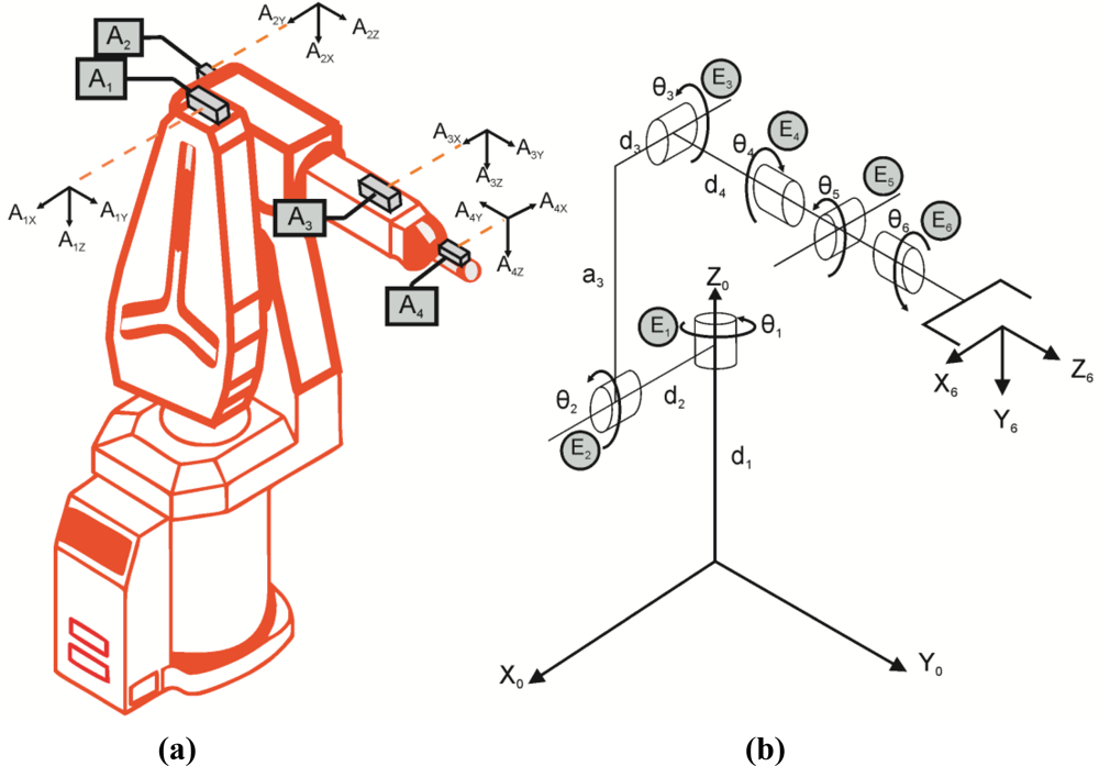 A sensor network is an array of diverse types of sensors to monitor several variables [25,26]; in this case the angular position of the joint flexibilities of the robot. The sensor network arranged on the robot is presented in Figure 1. Figure 1(a) depicts the position of the accelerometers on the robot. Aix, Aiy and Aiz are the measurements of each axis from the accelerometer Ai. Figure 1(b) is a schematic of the robot including its link parameters. θi represents the angular position of joint i. ai and di represents the robot physical dimensions. Also, the localization of encoders Ei is shown.