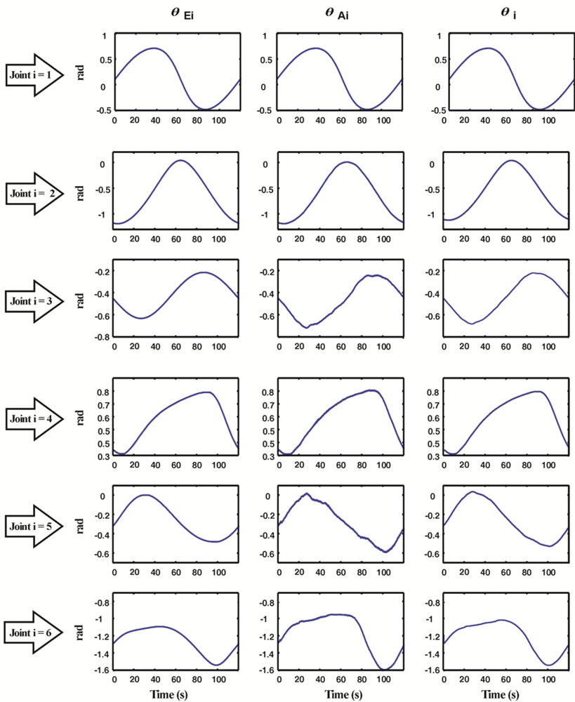 Figure 10 shows the angular position θi obtained after the fusion and decimation of the angular position estimated with accelerometers θAi and the estimated with encoders θEi. Fused angular position takes the best of each sensor, the high resolution of encoders and the absolute measuring provided by accelerometers.