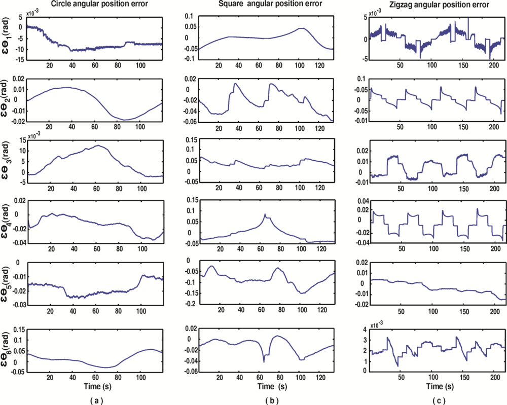 With the aim of depicting the controller tracking monitored with the fused smart sensor network, Figure 11 shows the controller errors in each joint of the robot ɛθi, when circle [Figure 11(a)], square [Figure 11(b)] and zigzag [Figure 11(c)] paths are executed.