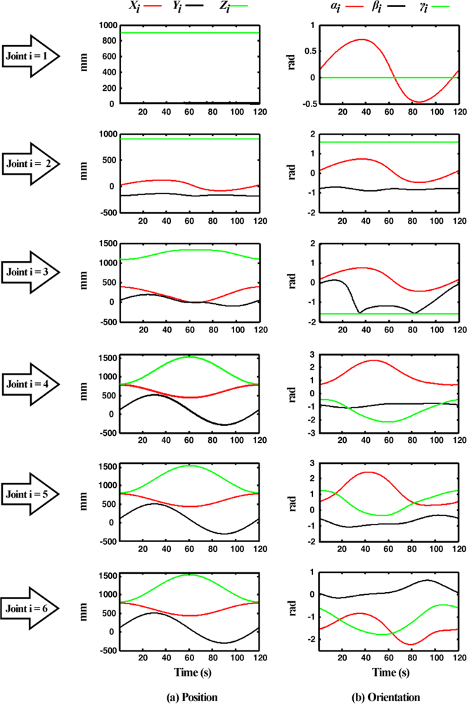 In Figure 12, the obtained angular position θi and the dimensions (ai,di), are used by the forward kinematics processor in order to obtain the position [Figure 12(a)] and orientation [Figure 12(b)] for each joint. The obtained data corresponds to the circle path.