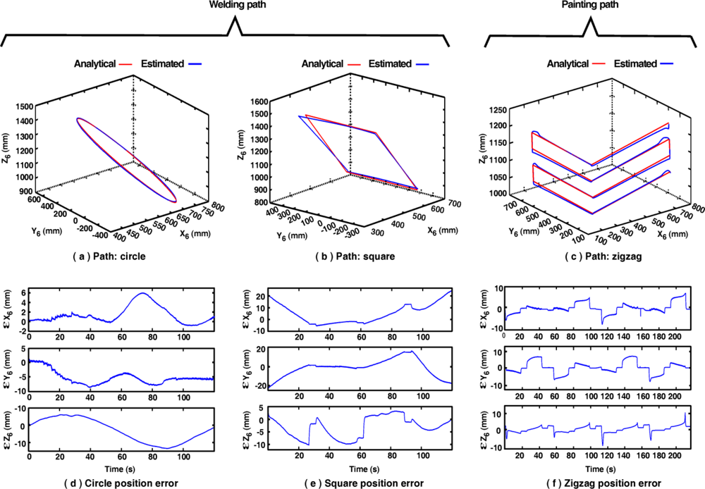 The end effector position errors (ɛX6,ɛY6,ɛZ6) and orientation errors (ɛα6,ɛβ6,ɛγ6) are found with the fused smart sensor network are summarized in Table 5. The major problems are found in the square path, where the highest absolute and relative errors are measured. Such errors could be utilized by the controller and compensate them in order to increase the robot accuracy.