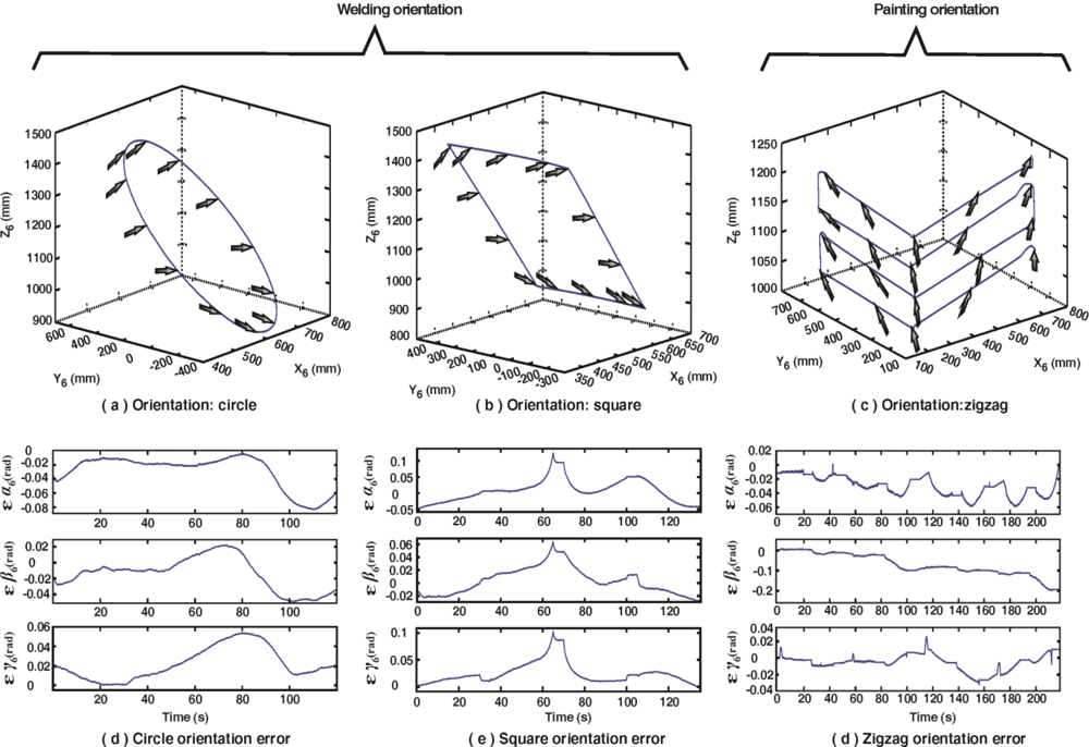 As well as position, the orientation end effector accuracy is evaluated using the fused smart sensor network. A representation of the monitored orientation is shown in Figure 14(a) for the case of circle path, Figure 14(b) for the case of square path and Figure 14(c) for the zigzag path. Figure 14(d–e) show the orientation errors (ɛα6,ɛβ6,ɛγ6) for the circle, square and zigzag path respectively. Controller error oscillates around 0.08 rad for the circle path, around 0.1 rad in the case of the square path and 0.06 rad for the zigzag path.