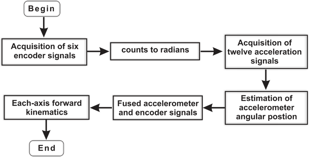 Encoders can provide a high-resolution measurement, but they are not capable of detecting some nonlinearities. Conversely, accelerometers, mounted on the robot, can detect some joint flexibilities and they provide an absolute measuring of orientation as well; however, the measurements are noisy and need filtering before being used. The fusion information of encoder and accelerometer takes the best of both sensors incrementing the accuracy of the monitored angular positions. A flow diagram that depicts the required sequential computing for sensor fusion and forward kinematics estimation is presented in Figure 2. The required operations are the acquisition of six encoder signals, conversion from encoder counts to radians, acquisition of twelve accelerometer signals, estimation of each-joint angular position, Fusion of encoder and accelerometer signals and the estimation of the forward kinematics for each axis.