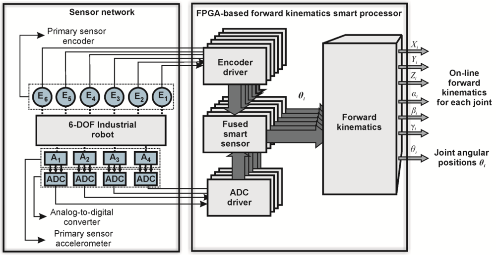 Flexible manipulator robots have a wide industrial application. Robot performance requires sensing its position and orientation adequately, known as forward kinematics. Commercially available, motion controllers use high-resolution optical encoders to sense the position of each joint which cannot detect some mechanical deformations that decrease the accuracy of the robot position and orientation. To overcome those problems, several sensor fusion methods have been proposed but at expenses of high-computational load, which avoids the online measurement of the joint’s angular position and the online forward kinematics estimation. The contribution of this work is to propose a fused smart sensor network to estimate the forward kinematics of an industrial robot. The developed smart processor uses Kalman filters to filter and to fuse the information of the sensor network. Two primary sensors are used: an optical encoder, and a 3-axis accelerometer. In order to obtain the position and orientation of each joint online a field-programmable gate array (FPGA) is used in the hardware implementation taking advantage of the parallel computation capabilities and reconfigurability of this device. With the aim of evaluating the smart sensor network performance, three real-operation-oriented paths are executed and monitored in a 6-degree of freedom robot.1. Introduction