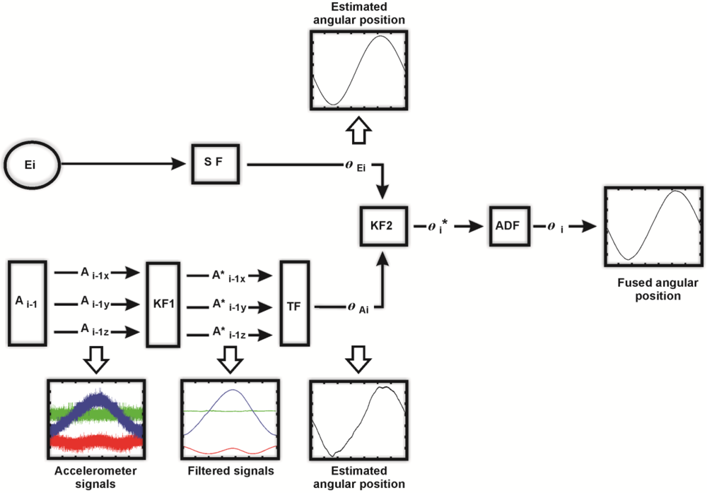 Stage KF2 is a Kalman filter designed for the sensor fusion of two signals; in this case the parameters of the general Equations (8–12):S = 1; B = 0; , Z = [θEi, θAi]T, Q, is the covariance of the angular position; R is a diagonal matrix with the noise covariance of each input signal and H = [1,1]T.