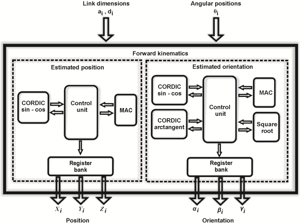 An important block of the smart processor is the block in charge of the forward kinematics (Figure 5). The input parameters are the link dimensions (ai, di) and the angular position of each link (θi), those parameters are used by two sub-processors to estimate position (Xi, Yi, Zi) and orientation (αi,βi,γi) of each link in concordance with Equations (4–7). The position estimator uses a multiplier-accumulator unit (MAC) and a coordinate rotation digital computer (CORDIC) configured to execute sine and cosine operations [32]; both are coordinated by a control unit that manages the operations performed for each unit. The estimated position is sent to a register bank. At the same time, the orientation estimator calculates the orientation of each joint. This processor has two embedded CORDIC units to estimate sine, cosine and arctangent functions. Also, a square root unit and a MAC unit are embedded. Alike the position estimator, a control unit coordinates the operations executed for each block and, when the orientation estimation is ready, the data is sent to the register bank.