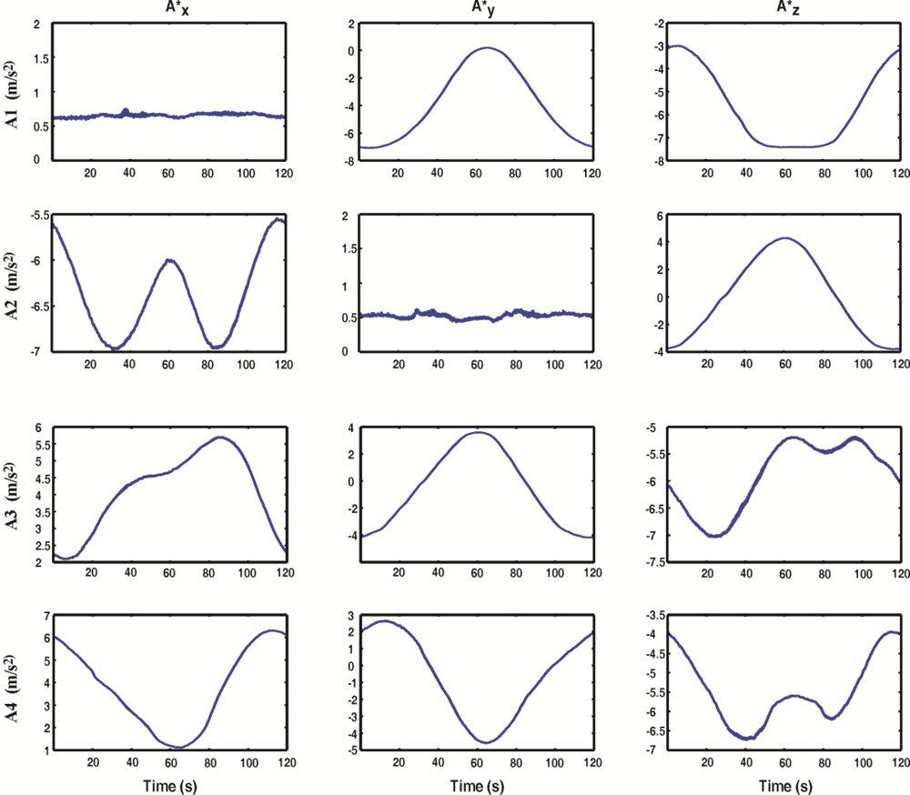 Concerning the filtering stage KF1, matrix S is an identity matrix; B = 0; , Z = [Ai−1X,Ai−1Y,Ai−1Z]T; Q is a diagonal matrix containing the covariance of each signal; likewise, R is a diagonal matrix with the noise covariance of each signal and H is an identity matrix. The processing unit TF differs for each joint of the robot. Required equations are summarized in Table 1.