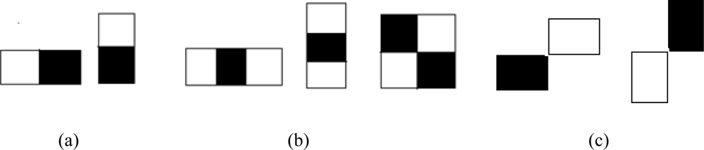 In pattern recognition, object detection generally is a two-class classification problem with two essential issues of feature selection and classifier design based on the selected features. Classifiers based on Haar-like features [1] have been successfully used for object detection. Viola and Jones [2] proposed an object detection framework where these Haar-like features are selected and classifier is trained using AdaBoost [3]. This approach has become a popular framework for object detection and several extensions of this framework have been proposed. One of the extensions is the improvement in the boosting algorithm. Modified versions of AdaBoost such as Real AdaBoost [4], FloatBoost [5] and KLBoosting [6] are available. Real AdaBoost is used for multi-view face detection [7]. In addition to face detection [5] Float Boost is also applied to hand shape detection [8]. The other extension of the original framework is to use an extended set of Haar-like features so that different image patterns can be evaluated. In addition to the basic feature set of Figure 1(a), an extended set of Haar-like features as shown in Figure 1(b,c) are introduced in [9,10], and [11]. Mita et al. [12] have selected multiple co-occurring linear weak classifiers to form a more efficient classifier. Boosting in a hierarchical feature space where the local Haar-like features are replaced by global features derived from PCA in later stages of boosting is introduced in [13]. An extension of Haar-like features in which different weights, determined by techniques like Brute force search, Genetic algorithms and Fischer’s linear discriminant analysis, are assigned to the rectangles of Haar-like features is proposed in [14]. Hybrid features composed of gradient features, Edgelet features and Haar-like features are used in [15] for pedestrian detection.