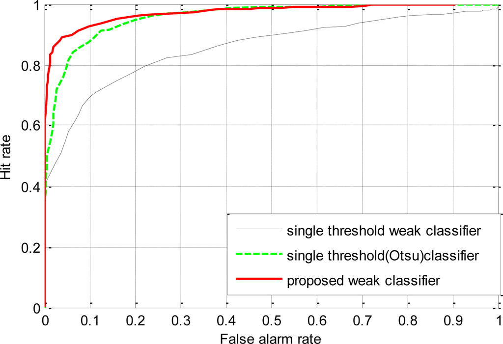 In this experiment, the classifiers were trained on relatively difficult samples than those of Section 4.2. The positive samples contained 500 positive images from the original training set. The negative samples contained 2,000 negative images. The negative samples were the false positives generated when a 10 stage cascade was evaluated on random high resolution images. The 10 stage cascade was trained on the original training set using the single threshold weak classifiers. In this sense, the negative samples are relatively difficult for the single threshold weak classifiers to discriminate. Three different classifiers were trained using the three types of weak classifiers on this data to achieve 100% hit rate and zero false positives. The classifier using the proposed weak classifiers required only 36 features whereas the classifier using single threshold weak classifier employing average of means required 236 features and the classifier employing Otsu’s thresholding method required 90 features to achieve same performance on the training data. This shows that the proposed weak classifiers are equally efficient in discriminating difficult samples than the single threshold counterparts. The generalization performance of the trained classifiers was tested on the validation set as in Section 4.2. The ROC curves in Figure 10, generated against the validation dataset show significant performance improvement of the classifier trained using the proposed weak classifiers over the classifier using single threshold weak classifiers.