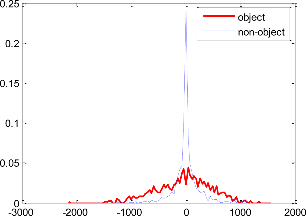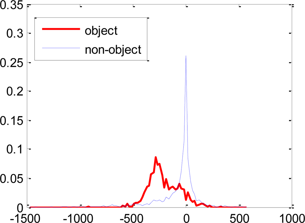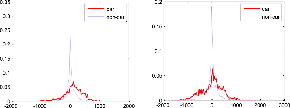 The Haar-like features have scalar values that represent the difference in the sum of intensities between the adjacent rectangular regions. To capture the ad hoc knowledge about the domain, these features are evaluated at different positions and with different sizes exhaustively according to the base resolution of the classifier. For example, when the classifier resolution is 24 × 18 pixels, 91,620 features are generated from the five features in Figure 1(a,b). Each feature is evaluated on all the training samples and the probability density for each of the object and non-object class is calculated as shown in Figure 2. In [2], a single threshold that separates these two distributions is selected for each feature. These features along with their respective thresholds and polarity form the weak classifiers for the learning algorithm.