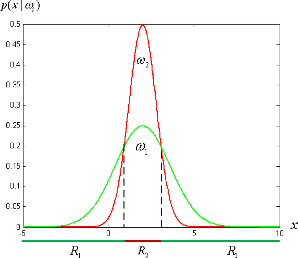 The discriminant functions of Equation (4) are inherently quadratic. The decision surfaces are hyperquadrics and in one dimensional case the decision regions needn’t be simply connected as shown in Figure 3. This observation motivates us to formulate new kind of weak classifiers without explicitly specifying the threshold for each weak classifier.