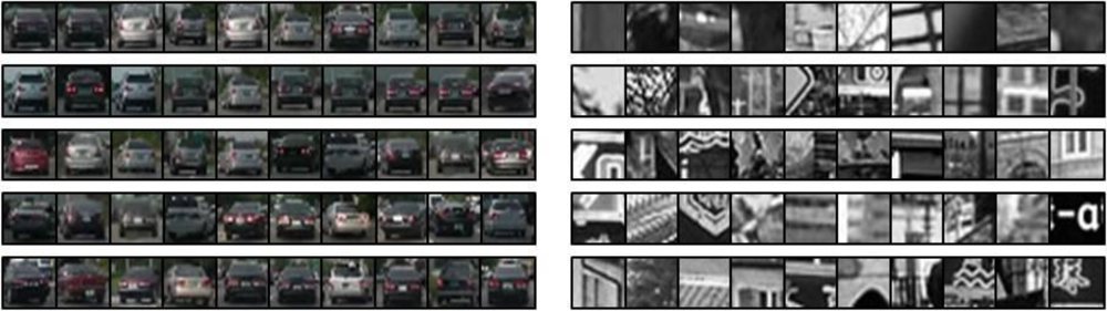 The experiments were carried out for detection of rear of cars. The experiments were done using 1,500 positive and 3,500 negative samples. The positive samples consisted of instances of rear of cars cropped from a video taken from a camera mounted at the front of a host car while driving in an urban environment. Each instance was resized to a base size of 24 × 18 pixels. The negative samples consisted of images cropped from random high resolution images that did not contain any instance of rear of car. Each negative sample was also resized to base size of 24 × 18 pixels. 1,000 positives and 3,000 negative samples were used for training the classifiers while the remaining 500 positive and 500 negative samples were used for validation. Figure 5 shows some of the positive and negative samples used for the experiment.