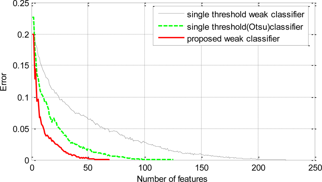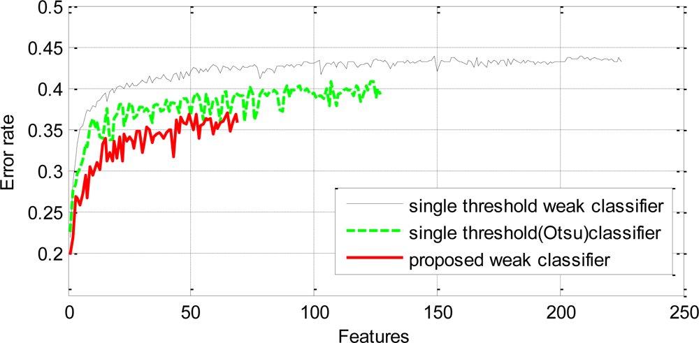 A single stage classifier was trained by AdaBoost on the training data using the proposed weak classifiers to achieve 100% hit rate on the positive samples and zero false positive on the negative samples. The final strong classifier achieved the required performance on the training data with a total of 69 proposed weak classifiers. The first weak classifier selected by AdaBoost yielded an error rate of 0.2. The subsequent selected weak classifiers yielded comparatively higher error rates. The worst error rate among the selected classifiers was 0.37 for the 66th classifier. The error rates of subsequent selected classifiers can be seen in Figure 6. Another strong classifier was trained on the same training data using the conventional single threshold based weak classifiers. These classifiers employed the average of means as the threshold. The final strong classifier required 225 weak classifiers to achieve similar performance on the training data. The error rate of the first selected weak classifier was 0.21 but it increased rapidly for the subsequent classifiers and the worst was 0.44 for the 208th classifier. A third strong classifier was trained on the same training data using single threshold based weak classifiers which employed Otsu’s method [17] for optimal threshold selection. The final classifier consisted of 125 weak classifiers. The error rate of the first weak classifier was 0.22 and the highest error rate was 0.41 for the 124th classifier. Figure 6 shows that the error rates of the proposed weak classifiers are consistently lower than the single threshold based counterparts.