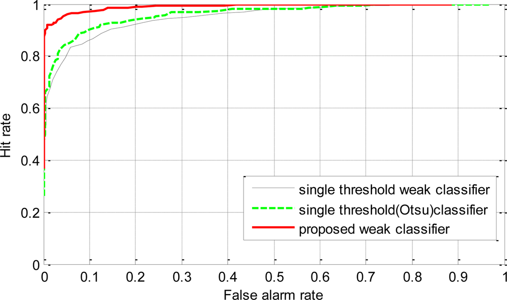 To investigate the generalization performance of the proposed weak classifiers, the strong classifiers were tested on a validation dataset. The validation data set consisted of 500 positive and 500 negative sample images that were not used for training. ROC curves were generated using the validation dataset. The points in the ROC curves were obtained by evaluating each of the strong classifiers against the validation dataset by sliding the stage threshold from −10 to +10 at step of 0.25. The thresholds for the stage were chosen because varying the thresholds in this range proved to be sufficient to generate the whole range in the ROC curves. The plot of the hit rate versus the false alarm rate for all the methods is given in Figure 9. From the ROC curves in Figure 9, we can see that the classifier trained using the proposed weak classifiers perform consistently better than the classifier trained using single threshold weak classifiers. The detection rate of the classifier based on the proposed weak classifiers is always higher than the classifier based on single threshold weak classifiers. And for a given detection rate, the classifier using the proposed weak classifier always has less false alarm rate than the classifiers using single threshold weak classifiers. The higher performance of the proposed method reflects the benefit of the usage of discriminant function based weak classifiers, which are more effective at discriminating car and non-car examples.