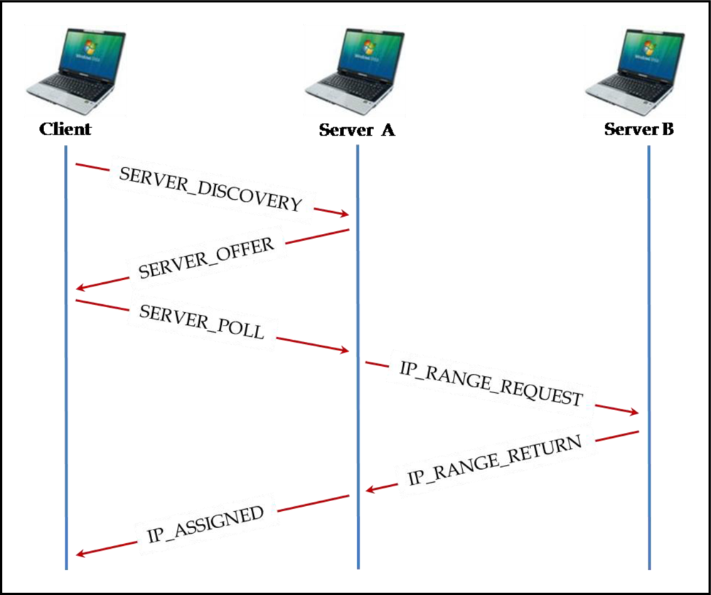 SERVER_OFFER: The network nodes receiving the SERVER_DISCOVERY message reply to this message, also using the MAC layer, in which an IP address number is offered. The number of addresses offered is half of the available range. The SERVER_DISCOVERY message includes a Count field indicating how many attempts have been made by the client. Depending on its value, the server nodes will behave as follows: