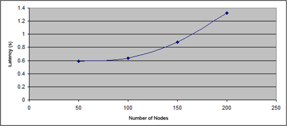 Firstly the latency in the process of assigning addresses. Figures 11 and 12 show the evolution of the latency value depending on the nodes number in the network. Figure 11 shows the values using IPv4 addresses from class C, i.e., with 254 available addresses. Figure 12 uses IPv4 addresses from Class B, providing 65534 addresses. Figure 11 shows that the increase in time address allocation begins to grow more quickly from the 125 nodes. However, using addresses from class B (Figure 12), the time experiences a very slight growth up to 1,600 nodes which were simulated.