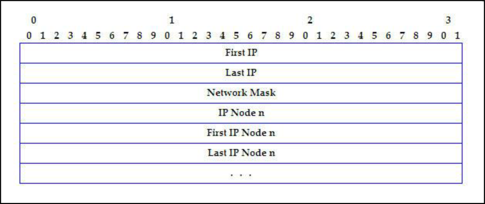 IP Node n, First IP Node n, Last IP Node n: This represents an entry on the free block table for all the nodes in the network. Each node is represented by these fields of 4 bytes, each one being: the node IP address, the initial IP address and the final from its free address block, respectively.