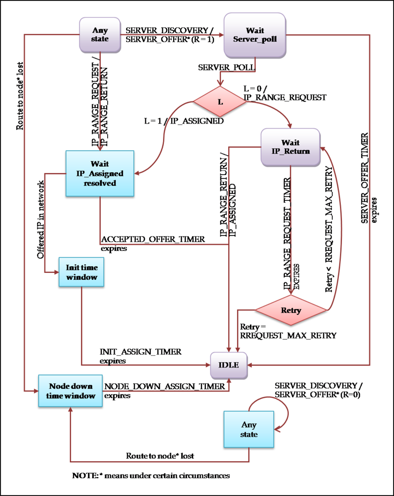 Wait IP_return: In this state the node is waiting for the reception of an IP_RANGE_RETURN message. When it receives this message, in which a node in the network indicates it has a block that it can offer the client in waiting; it will send an IP_ASSIGNED message to the client. After this, the node will have ended its function as server, and will pass to the IDLE state. If the IP_RANGE_RETURN message is not received before the timer IP_RANGE_REQUEST_TIMER expires, it will turn to try the request sending again an IP_RANGE_REQUEST message a maximum number of times RREQUEST_MAX_RETRY. These successive attempts are sent in every occasion to a different node. If the limit of attempts is exceeded, then the node will desist and change its state to IDLE.