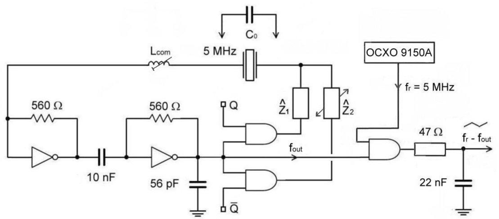 For this research a quartz switching oscillator circuit (Figure 1) was experimentally selected switching between impedances Ẑ1 and Ẑ2 with the frequency 1 Hz. The impedances in this research are defined as 1/jωC. The C values were in the range 2.5 pF to 40 pF. Within 2 s time, the counter measured both frequencies f (Q) and f (Q̄).