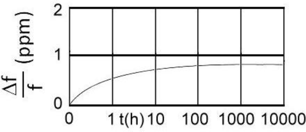 Frequency variation is normally considered in short term stability (second-to-second and minute-to-minute temperature characteristics) and long term stability over days, months or years, called ageing. The short term stability of a quartz crystal depends on the actual oscillator design and is totally controlled by the quartz crystal at low drive levels (30 μW). The ageing rate is substantially influenced by the cleanliness of the resonator, the stability of the inert gas filling and the security of the final sealing process. Ageing is naturally greater during the first part of the life of the crystal unit. The frequency ageing can often be described by function of the form of time t (Figure 3) [11–14].